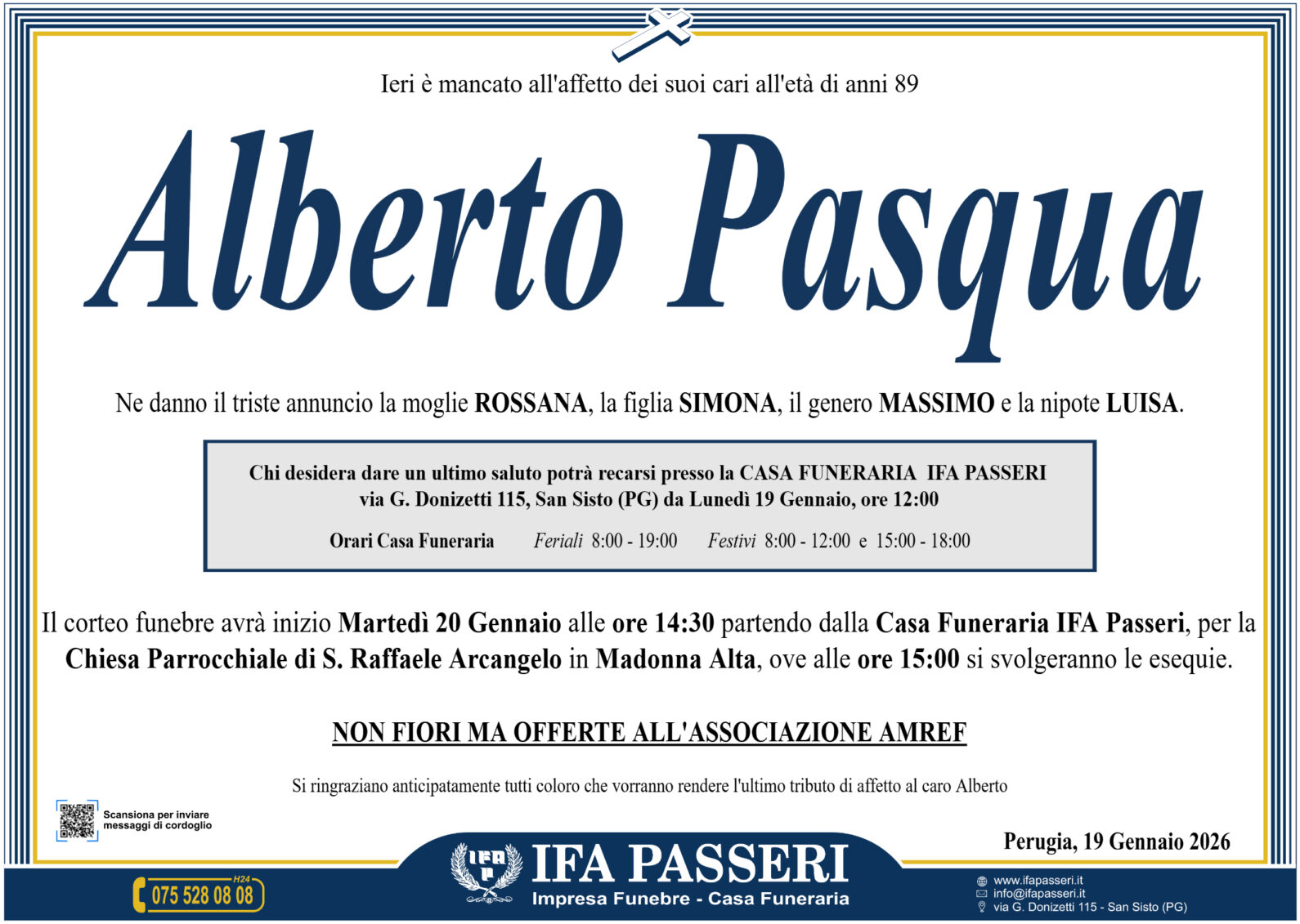 Alberto Pasqua Martedì 20 Gennaio ࠃ Partenza Casa Funeraria IFA Passeri, ore 14:30 Chiesa Parrocchiale di S. Raffaele Arcangelo in Madonna Alta, ore 15:00 Non fiori ma offerte all'associazione AMREF Label Nome e Cognome* La tua Email* Modalità di pubblicazione: Autorizzo l'invio ai familiari e l'eventuale pubblicazione sul sito Ifapasseri Autorizzo esclusivamente l'invio riservato ai familiari Ho preso visione della Privacy Policy e della Cookie Policy del portale ifapasseri.it ed accetto espressamente il trattamento dei dati richiesti. Label Nome e Cognome* La tua Email* Ho preso visione della Privacy Policy e della Cookie Policy del portale ifapasseri.it ed accetto espressamente il trattamento dei dati richiesti. 0 Messaggi Inline Feedbacks View all comments