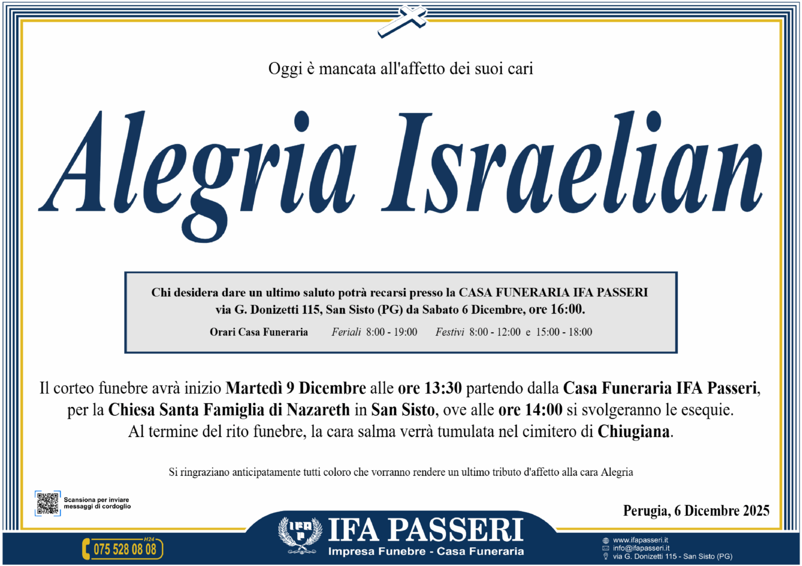 Alegria Israelian Martedì 9 Dicembre ࠃ Partenza Casa Funeraria IFA Passeri, ore 13:30 Chiesa Santa Famiglia di Nazareth in San Sisto, ore 14:00 Label Nome e Cognome* La tua Email* Modalità di pubblicazione: Autorizzo l'invio ai familiari e l'eventuale pubblicazione sul sito Ifapasseri Autorizzo esclusivamente l'invio riservato ai familiari Ho preso visione della Privacy Policy e della Cookie Policy del portale ifapasseri.it ed accetto espressamente il trattamento dei dati richiesti. Label Nome e Cognome* La tua Email* Ho preso visione della Privacy Policy e della Cookie Policy del portale ifapasseri.it ed accetto espressamente il trattamento dei dati richiesti. 0 Messaggi Inline Feedbacks View all comments