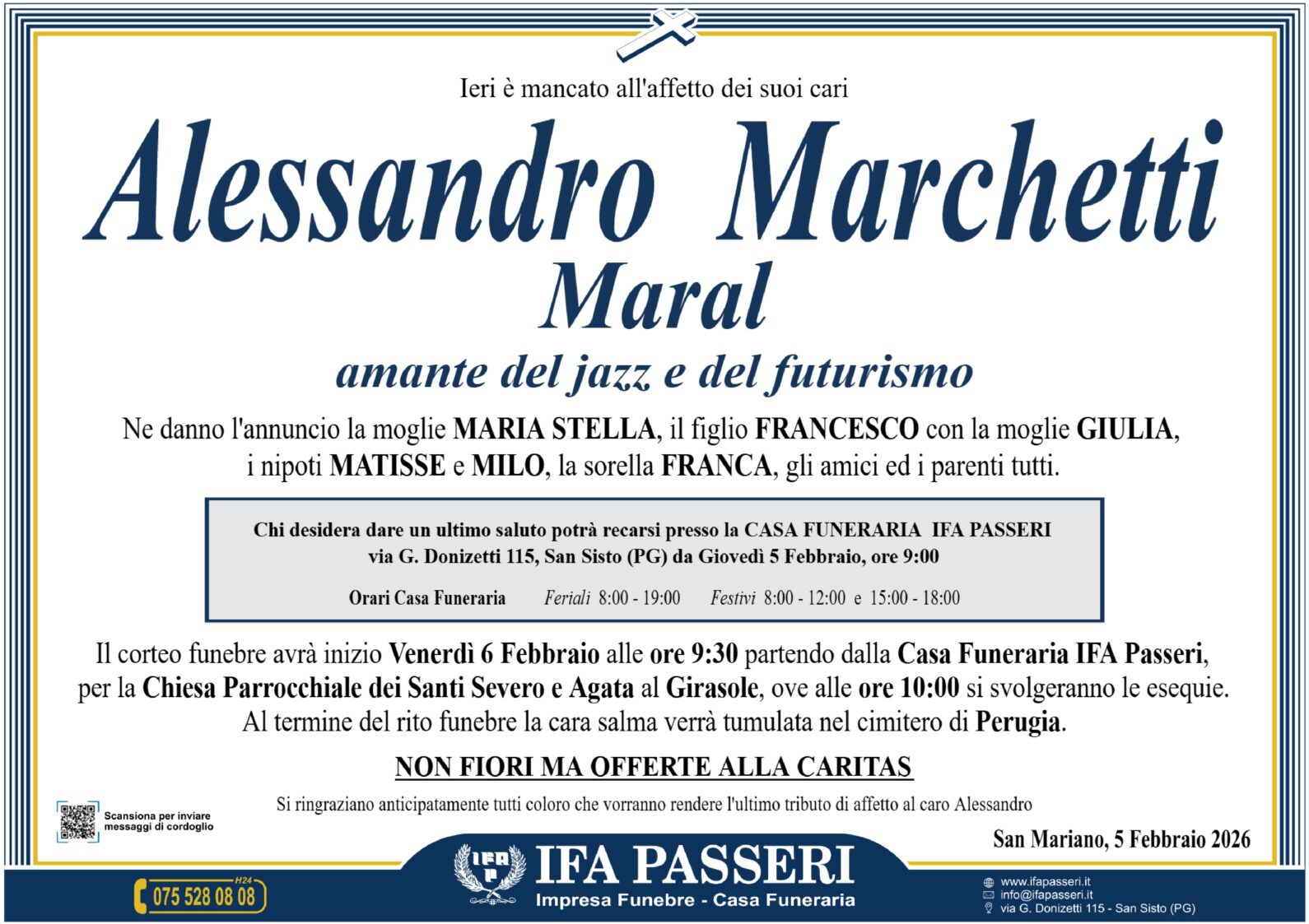 Alessandro Marchetti "Maral" Venerdì 6 Febbraio ࠃ Partenza Casa Funeraria IFA Passeri, ore 9:30 Chiesa Parrocchiale dei Santi Severo e Agata al Girasole, ore 10:00 Non fiori ma offerte alla CARITAS Label Nome e Cognome* La tua Email* Modalità di pubblicazione: Autorizzo l'invio ai familiari e l'eventuale pubblicazione sul sito Ifapasseri Autorizzo esclusivamente l'invio riservato ai familiari Ho preso visione della Privacy Policy e della Cookie Policy del portale ifapasseri.it ed accetto espressamente il trattamento dei dati richiesti. Label Nome e Cognome* La tua Email* Ho preso visione della Privacy Policy e della Cookie Policy del portale ifapasseri.it ed accetto espressamente il trattamento dei dati richiesti. 0 Messaggi Inline Feedbacks View all comments