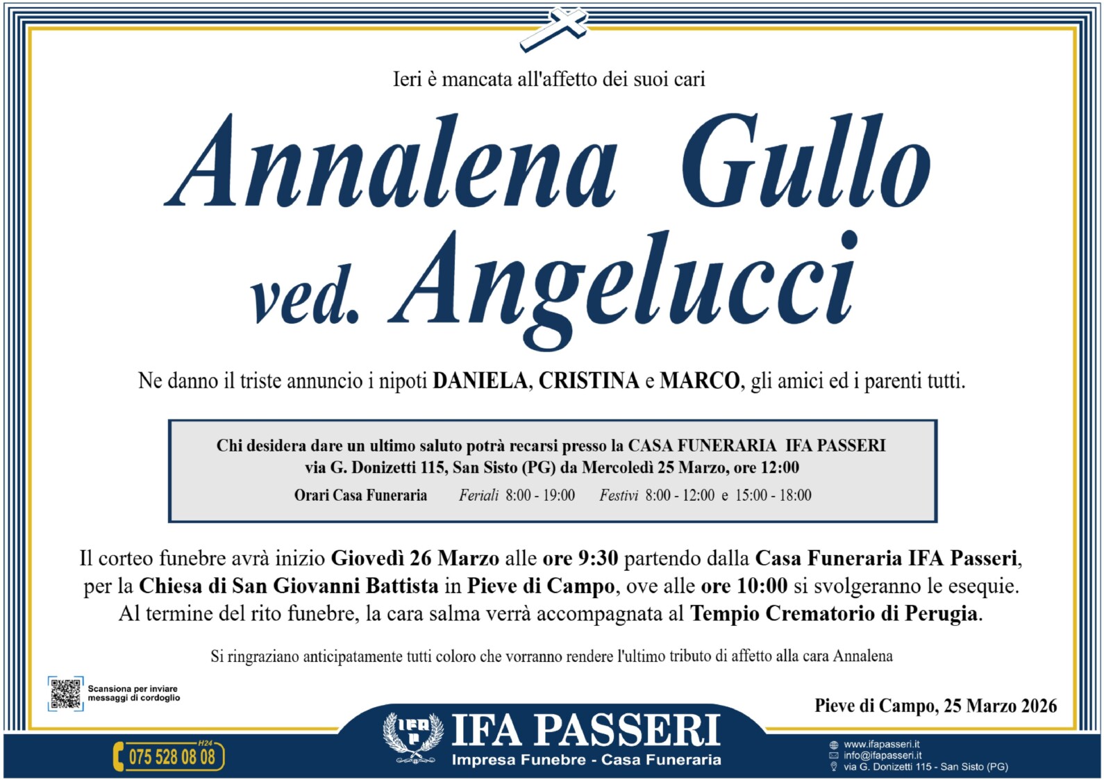 Annalena Gullo ved. Angelucci Giovedì 26 Marzo ࠃ Partenza Casa Funeraria IFA Passeri, ore 9:30 Chiesa di San Giovanni Battista in Pieve di Campo, ore 10:00 Label Nome e Cognome* La tua Email* Modalità di pubblicazione: Autorizzo l'invio ai familiari e l'eventuale pubblicazione sul sito Ifapasseri Autorizzo esclusivamente l'invio riservato ai familiari Ho preso visione della Privacy Policy e della Cookie Policy del portale ifapasseri.it ed accetto espressamente il trattamento dei dati richiesti. Label Nome e Cognome* La tua Email* Ho preso visione della Privacy Policy e della Cookie Policy del portale ifapasseri.it ed accetto espressamente il trattamento dei dati richiesti. 1 Messaggio Inline Feedbacks View all comments cristina angelucci Marzo 25, 2026 4:15 pm Quanta fatica quando ero ancora una ragazzina….ma piano piano, da donne adulte, il nostro legame si è saldato ed il nostro affetto cresciuto!