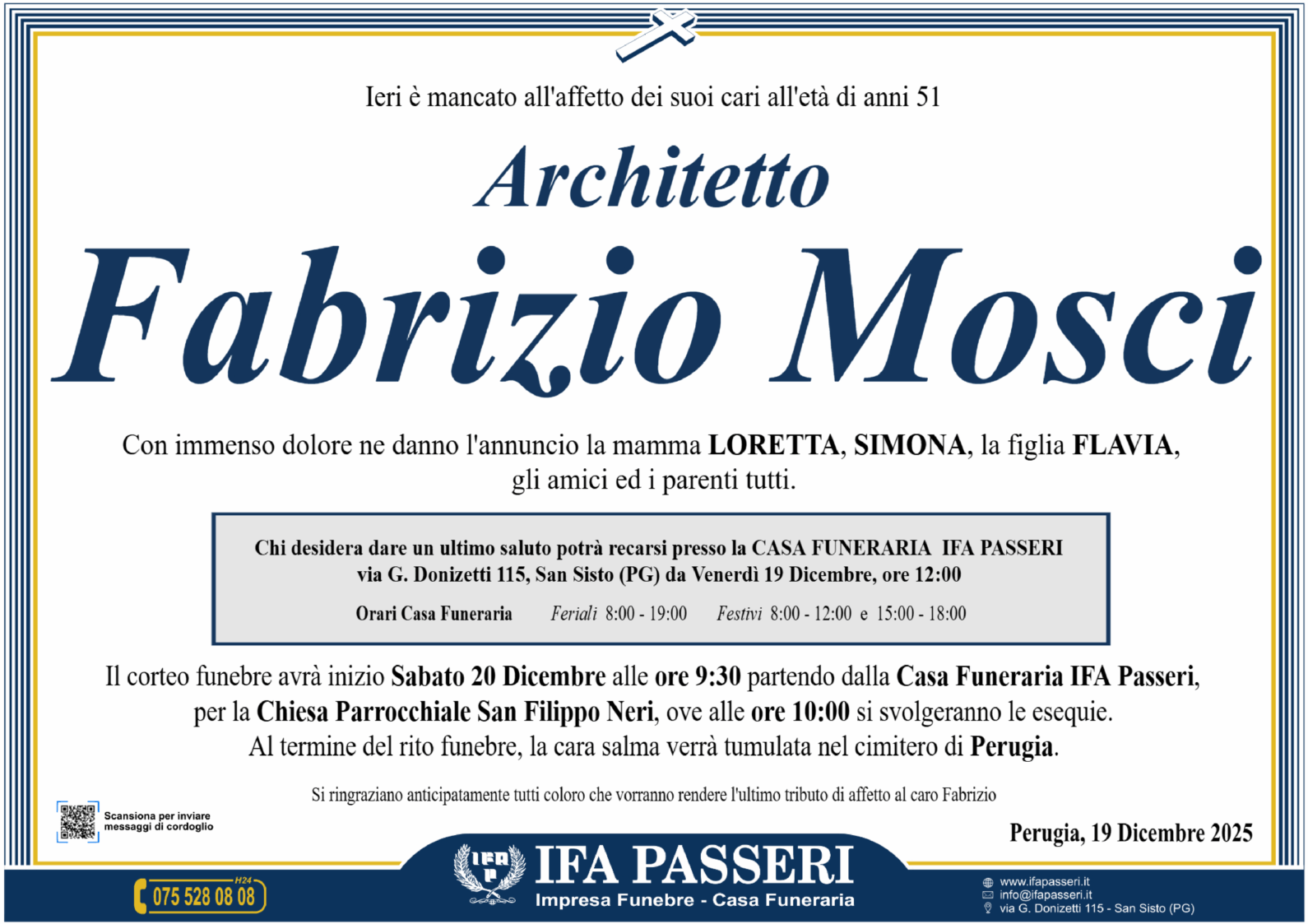 Architetto Fabrizio Mosci Sabato 20 Dicembre ࠃ Partenza Casa Funeraria IFA Passeri, ore 9:30 Chiesa Parrocchiale San Filippo Neri, ore 10:00 Label Nome e Cognome* La tua Email* Modalità di pubblicazione: Autorizzo l'invio ai familiari e l'eventuale pubblicazione sul sito Ifapasseri Autorizzo esclusivamente l'invio riservato ai familiari Ho preso visione della Privacy Policy e della Cookie Policy del portale ifapasseri.it ed accetto espressamente il trattamento dei dati richiesti. Label Nome e Cognome* La tua Email* Ho preso visione della Privacy Policy e della Cookie Policy del portale ifapasseri.it ed accetto espressamente il trattamento dei dati richiesti. 1 Messaggio Inline Feedbacks View all comments Alessandra Chiavegatti Dicembre 19, 2025 9:01 am Caro Fabrizio, la tua dipartita mi ha lasciato senza parole. Ricordo la tua dolcezza, l’integrita’, l’amicizia. Che tu possa splendere nella luce eterna. Sono vicina con tutto il cuore a Loretta, Flavia e tutte le persone che lo amavano.