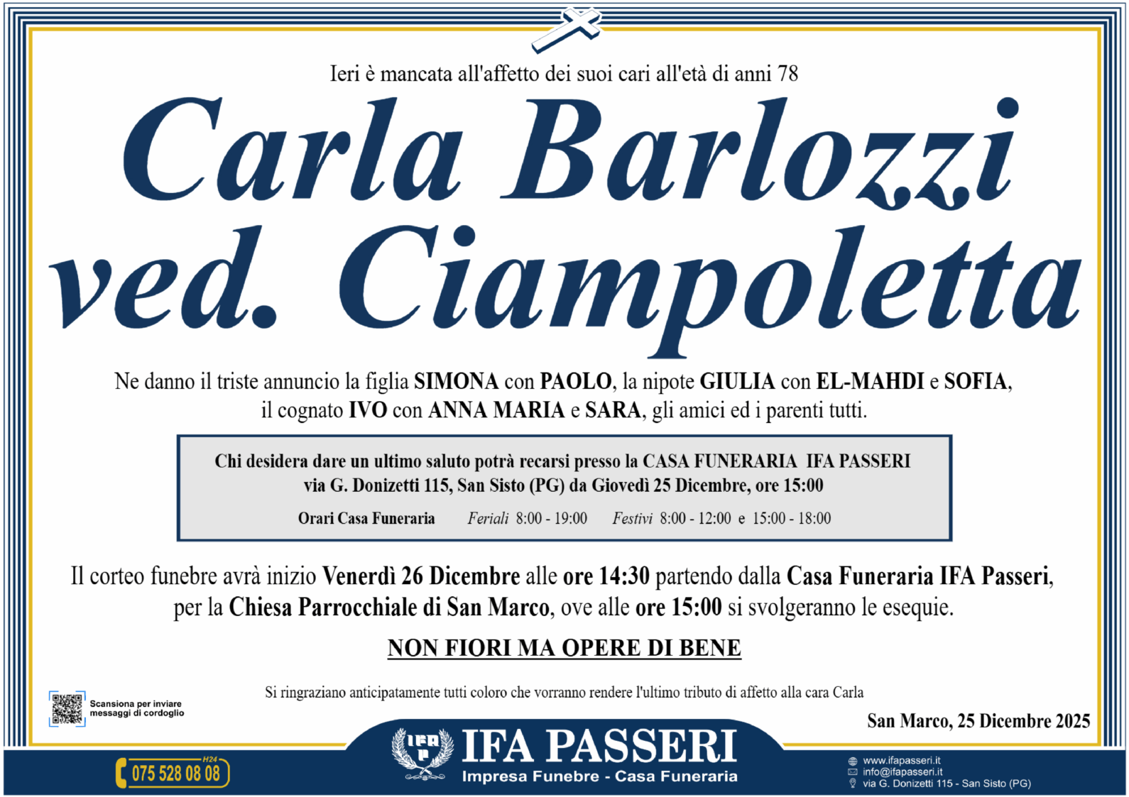 Carla Barlozzi ved. Ciampoletta Venerdì 26 Dicembre ࠃ Partenza Casa Funeraria IFA Passeri, ore 14:30 Chiesa Parrocchiale di San Marco, ore 15:00 Non fiori ma opere di bene Label Nome e Cognome* La tua Email* Modalità di pubblicazione: Autorizzo l'invio ai familiari e l'eventuale pubblicazione sul sito Ifapasseri Autorizzo esclusivamente l'invio riservato ai familiari Ho preso visione della Privacy Policy e della Cookie Policy del portale ifapasseri.it ed accetto espressamente il trattamento dei dati richiesti. Label Nome e Cognome* La tua Email* Ho preso visione della Privacy Policy e della Cookie Policy del portale ifapasseri.it ed accetto espressamente il trattamento dei dati richiesti. 0 Messaggi Inline Feedbacks View all comments