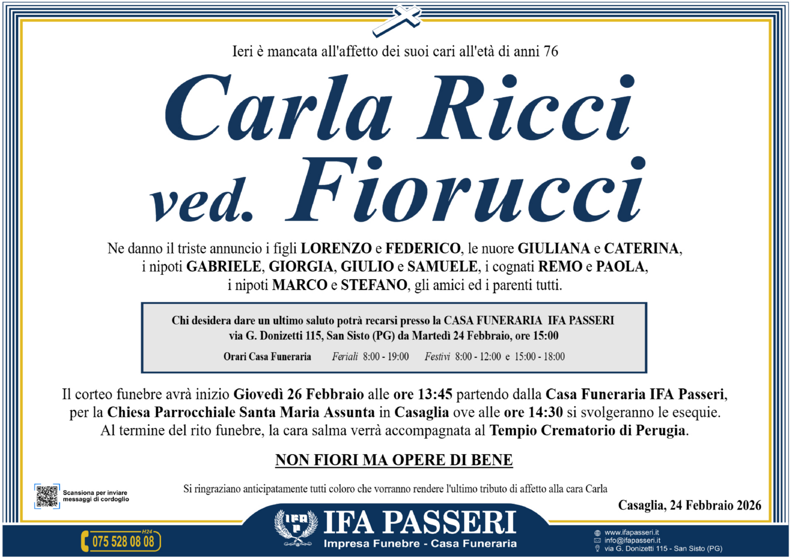 Pienamente dispiaciuti per la scomparsa di Carla, nostra affezionata cliente, ci stringiamo con affetto ai familiari.