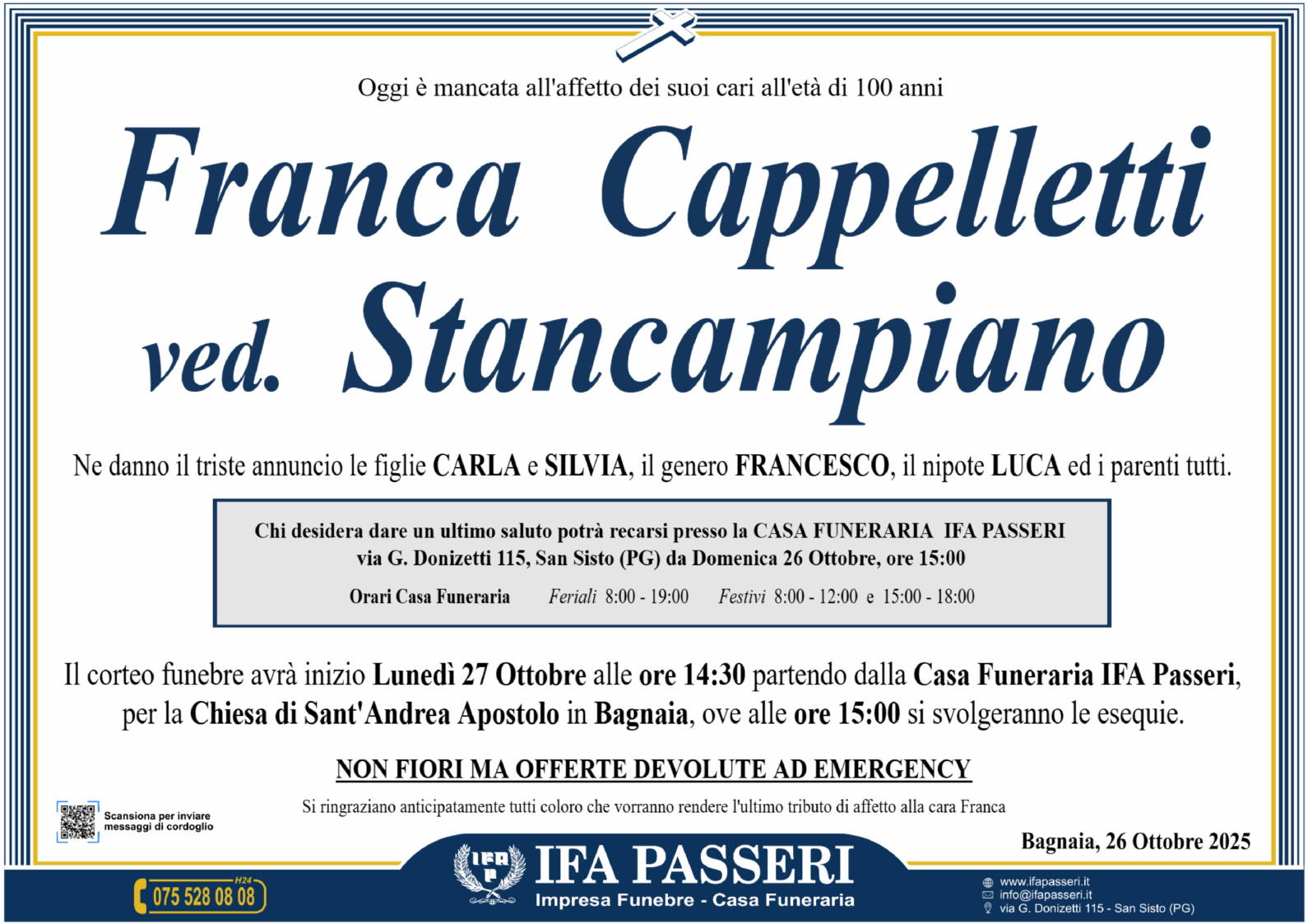 Franca Cappelletti ved. Stancampiano Lunedì 27 Ottobre ࠃ Partenza Casa Funeraria IFA Passeri, ore 14:30 Chiesa di Sant'Andrea Apostolo in Bagnaia, ore 15:00 Non fiori ma offerte ad Emergency Label Nome e Cognome* La tua Email* Modalità di pubblicazione: Autorizzo l'invio ai familiari e l'eventuale pubblicazione sul sito Ifapasseri Autorizzo esclusivamente l'invio riservato ai familiari Ho preso visione della Privacy Policy e della Cookie Policy del portale ifapasseri.it ed accetto espressamente il trattamento dei dati richiesti. Label Nome e Cognome* La tua Email* Ho preso visione della Privacy Policy e della Cookie Policy del portale ifapasseri.it ed accetto espressamente il trattamento dei dati richiesti. 0 Messaggi Inline Feedbacks View all comments