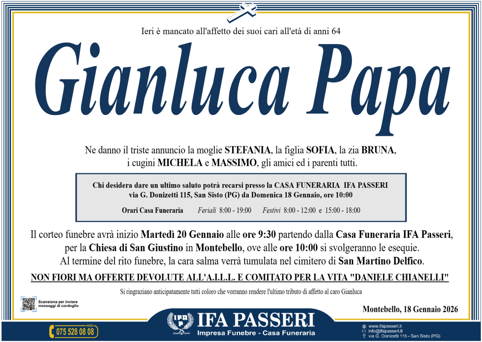 Non fiori ma offerte devolute all'A.I.L.L. e comitato per la vita " DANIELE CHIANELLI "