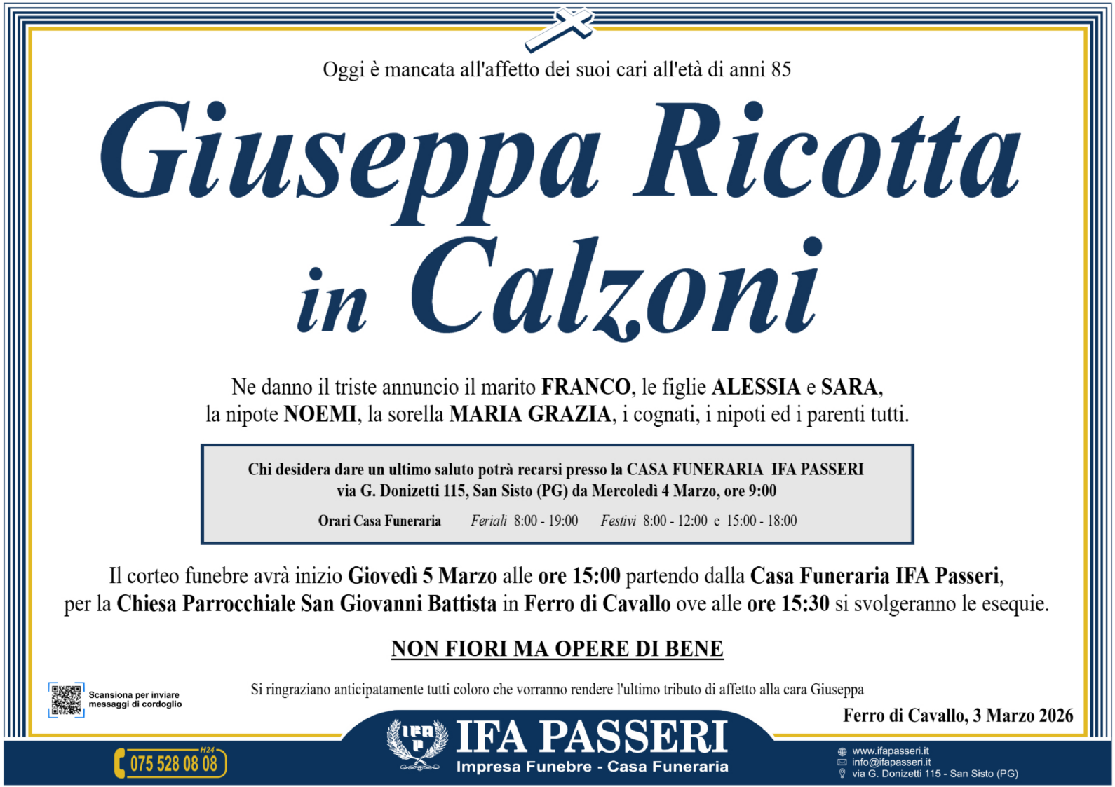 Giuseppa Ricotta in Calzoni Giovedì 5 Marzo ࠃ Partenza Casa Funeraria IFA Passeri, ore 15:00 Chiesa Parrocchiale San Giovanni Battista in Ferro di Cavallo, ore 15:30 Non fiori ma opere di bene Label Nome e Cognome* La tua Email* Modalità di pubblicazione: Autorizzo l'invio ai familiari e l'eventuale pubblicazione sul sito Ifapasseri Autorizzo esclusivamente l'invio riservato ai familiari Ho preso visione della Privacy Policy e della Cookie Policy del portale ifapasseri.it ed accetto espressamente il trattamento dei dati richiesti. Label Nome e Cognome* La tua Email* Ho preso visione della Privacy Policy e della Cookie Policy del portale ifapasseri.it ed accetto espressamente il trattamento dei dati richiesti. 0 Messaggi Inline Feedbacks View all comments