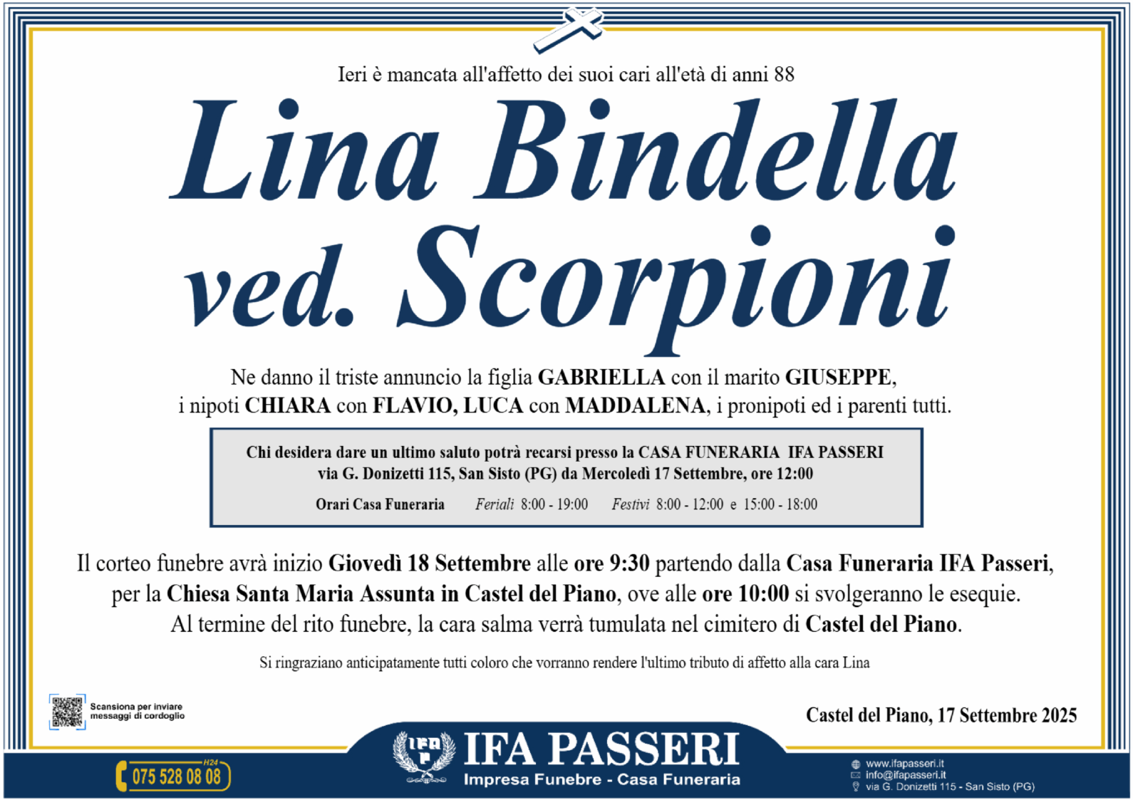 Lina Bindella ved. Scorpioni Giovedì 18 Settembre ࠃ Partenza Casa Funeraria IFA Passeri, ore 9:30 Chiesa Santa Maria Assunta in Castel del Piano, ore 10:00 Label Nome e Cognome* La tua Email* Modalità di pubblicazione: Autorizzo l'invio ai familiari e l'eventuale pubblicazione sul sito Ifapasseri Autorizzo esclusivamente l'invio riservato ai familiari Ho preso visione della Privacy Policy e della Cookie Policy del portale ifapasseri.it ed accetto espressamente il trattamento dei dati richiesti. Label Nome e Cognome* La tua Email* Ho preso visione della Privacy Policy e della Cookie Policy del portale ifapasseri.it ed accetto espressamente il trattamento dei dati richiesti. 0 Messaggi Inline Feedbacks View all comments