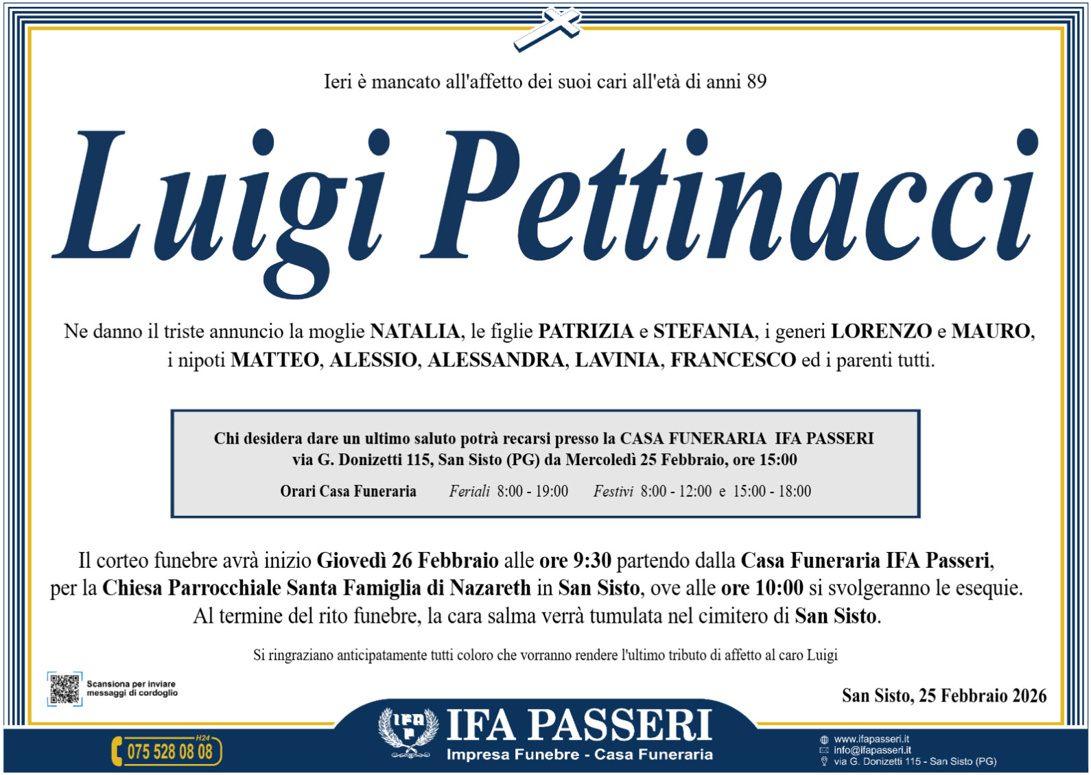 Luigi Pettinacci Giovedì 26 Febbraio ࠃ Partenza Casa Funeraria IFA Passeri, ore 9:30 Chiesa Parrocchiale Santa Famiglia di Nazareth in San Sisto, ore 10:00 Label Nome e Cognome* La tua Email* Modalità di pubblicazione: Autorizzo l'invio ai familiari e l'eventuale pubblicazione sul sito Ifapasseri Autorizzo esclusivamente l'invio riservato ai familiari Ho preso visione della Privacy Policy e della Cookie Policy del portale ifapasseri.it ed accetto espressamente il trattamento dei dati richiesti. Label Nome e Cognome* La tua Email* Ho preso visione della Privacy Policy e della Cookie Policy del portale ifapasseri.it ed accetto espressamente il trattamento dei dati richiesti. 0 Messaggi Inline Feedbacks View all comments