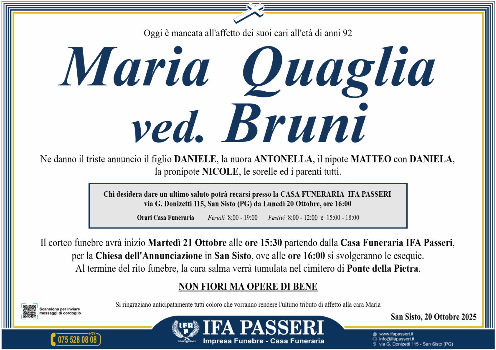 Maria Quaglia ved. Bruni Martedì 21 Ottobre ࠃ Partenza Casa Funeraria IFA Passeri, ore 15:30 Chiesa dell' Annunciazione in San Sisto, ore 16:00 Non fiori ma opere di bene Label Nome e Cognome* La tua Email* Modalità di pubblicazione: Autorizzo l'invio ai familiari e l'eventuale pubblicazione sul sito Ifapasseri Autorizzo esclusivamente l'invio riservato ai familiari Ho preso visione della Privacy Policy e della Cookie Policy del portale ifapasseri.it ed accetto espressamente il trattamento dei dati richiesti. Label Nome e Cognome* La tua Email* Ho preso visione della Privacy Policy e della Cookie Policy del portale ifapasseri.it ed accetto espressamente il trattamento dei dati richiesti. 0 Messaggi Inline Feedbacks View all comments