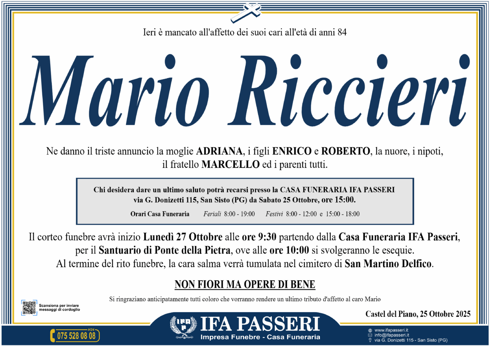 Mario Riccieri Lunedì 27 Ottobre ࠃ Partenza Casa Funeraria IFA Passeri, ore 9:30 Santuario di Ponte della Pietra, ore 10:00 Non fiori ma opere di bene Label Nome e Cognome* La tua Email* Modalità di pubblicazione: Autorizzo l'invio ai familiari e l'eventuale pubblicazione sul sito Ifapasseri Autorizzo esclusivamente l'invio riservato ai familiari Ho preso visione della Privacy Policy e della Cookie Policy del portale ifapasseri.it ed accetto espressamente il trattamento dei dati richiesti. Label Nome e Cognome* La tua Email* Ho preso visione della Privacy Policy e della Cookie Policy del portale ifapasseri.it ed accetto espressamente il trattamento dei dati richiesti. 0 Messaggi Inline Feedbacks View all comments