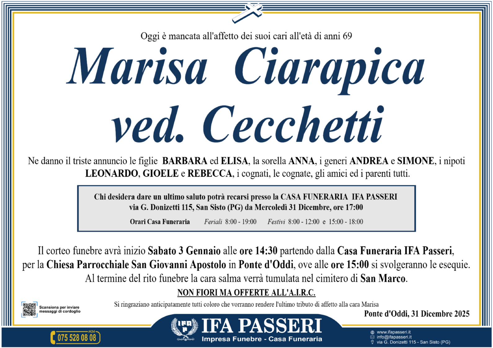 Marisa Ciarapica ved. Cecchetti Sabato 3 Gennaio ࠃ Partenza Casa Funeraria IFA Passeri, ore 14:30 Chiesa San Giovanni Apostolo in Ponte d'Oddi, ore 15:00 Non fiori ma offerte all'A.I.R.C. Label Nome e Cognome* La tua Email* Modalità di pubblicazione: Autorizzo l'invio ai familiari e l'eventuale pubblicazione sul sito Ifapasseri Autorizzo esclusivamente l'invio riservato ai familiari Ho preso visione della Privacy Policy e della Cookie Policy del portale ifapasseri.it ed accetto espressamente il trattamento dei dati richiesti. Label Nome e Cognome* La tua Email* Ho preso visione della Privacy Policy e della Cookie Policy del portale ifapasseri.it ed accetto espressamente il trattamento dei dati richiesti. 0 Messaggi Inline Feedbacks View all comments