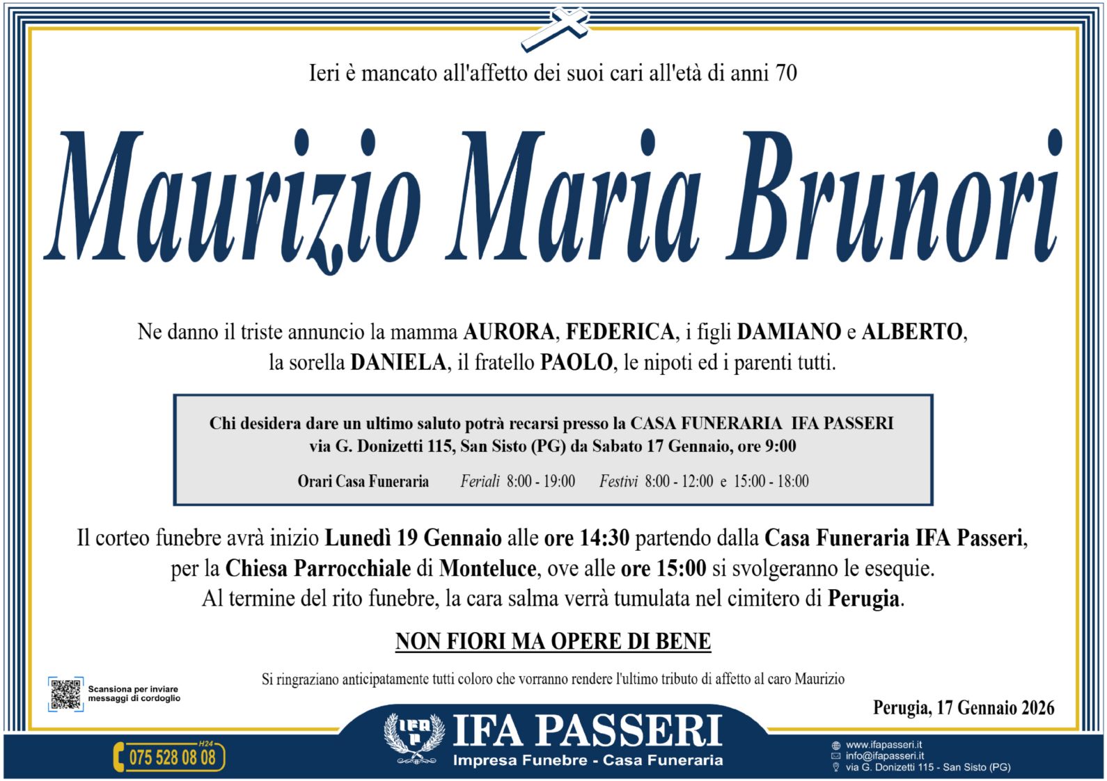 A nome mio e della mia intera famiglia esprimo vivissime condoglianze per la scomparsa del dottor Maurizio Maria Brunori, per decenni attento, scrupoloso e competente nostro medico di famiglia, come già lo fu suo padre. Un abbraccio affettuoso a tutta la famiglia Brunori. Emidio De Albentiis e famiglia