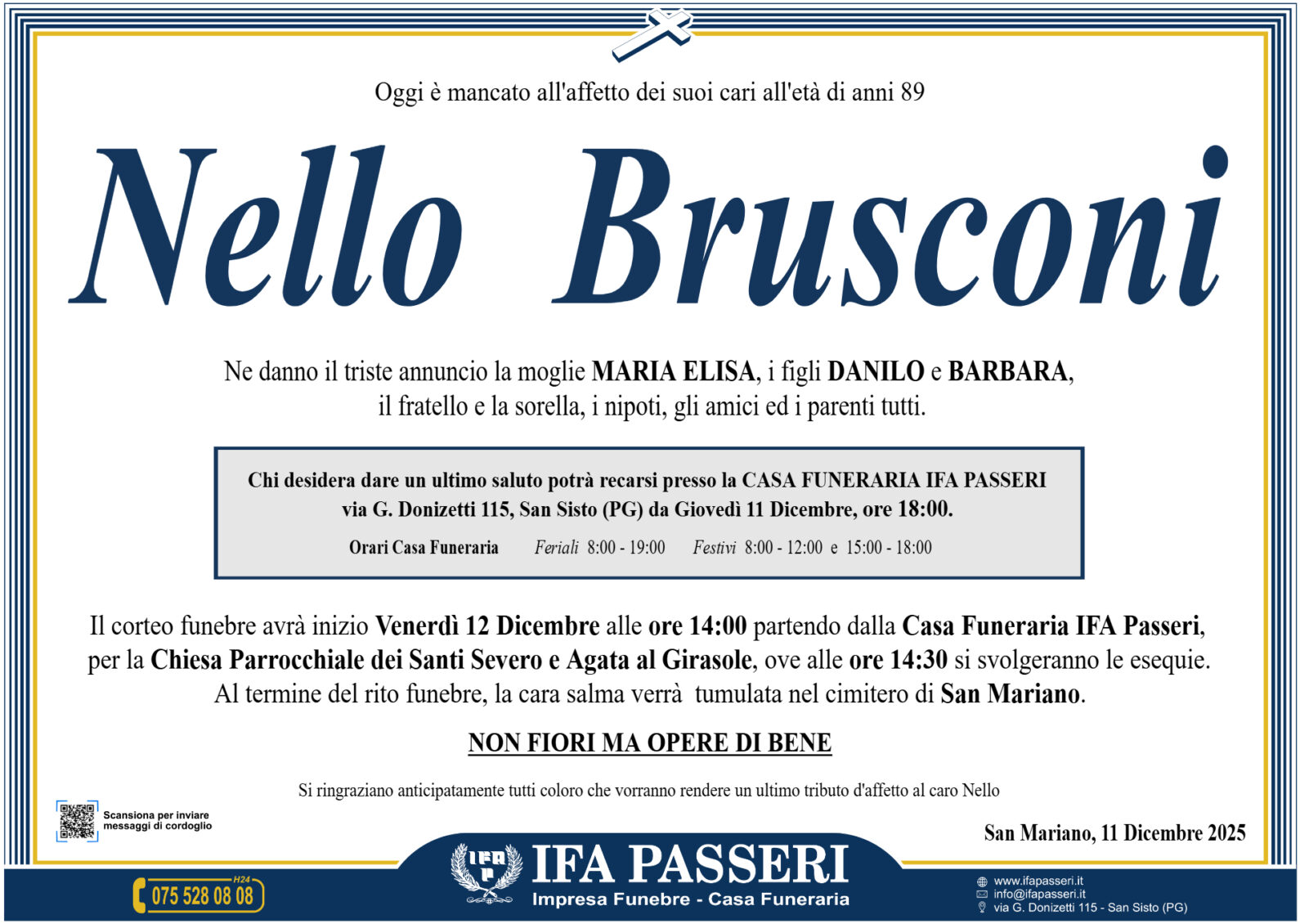 Nello Brusconi Venerdì 12 Dicembre ࠃ Partenza Casa Funeraria IFA Passeri, ore 14:00 Chiesa dei Santi Severo ed Agata al Girasole, ore 14:30 Non fiori ma opere di bene Label Nome e Cognome* La tua Email* Modalità di pubblicazione: Autorizzo l'invio ai familiari e l'eventuale pubblicazione sul sito Ifapasseri Autorizzo esclusivamente l'invio riservato ai familiari Ho preso visione della Privacy Policy e della Cookie Policy del portale ifapasseri.it ed accetto espressamente il trattamento dei dati richiesti. Label Nome e Cognome* La tua Email* Ho preso visione della Privacy Policy e della Cookie Policy del portale ifapasseri.it ed accetto espressamente il trattamento dei dati richiesti. 0 Messaggi Inline Feedbacks View all comments