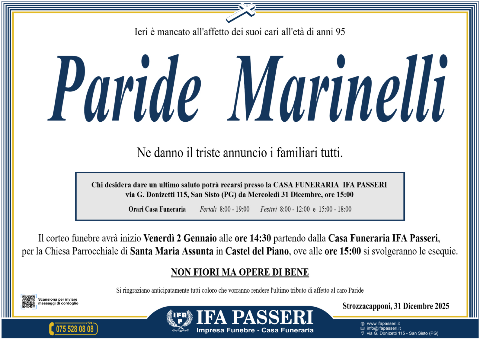 Paride Marinelli Venerdì 2 Gennaio ࠃ Partenza Casa Funeraria IFA Passeri, ore 14:30 Chiesa Santa Maria Assunta in Castel del Piano, ore 15:00 Non fiori ma opere di bene Label Nome e Cognome* La tua Email* Modalità di pubblicazione: Autorizzo l'invio ai familiari e l'eventuale pubblicazione sul sito Ifapasseri Autorizzo esclusivamente l'invio riservato ai familiari Ho preso visione della Privacy Policy e della Cookie Policy del portale ifapasseri.it ed accetto espressamente il trattamento dei dati richiesti. Label Nome e Cognome* La tua Email* Ho preso visione della Privacy Policy e della Cookie Policy del portale ifapasseri.it ed accetto espressamente il trattamento dei dati richiesti. 0 Messaggi Inline Feedbacks View all comments