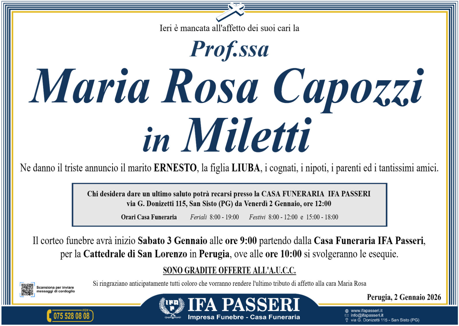Prof.ssa Maria Rosa Capozzi in Miletti Sabato 3 Gennaio ࠃ Partenza Casa Funeraria IFA Passeri, ore 9:00 Cattedrale di San Lorenzo in Perugia, ore 10:00 Sono gradite offerte all'A.U.C.C. Label Nome e Cognome* La tua Email* Modalità di pubblicazione: Autorizzo l'invio ai familiari e l'eventuale pubblicazione sul sito Ifapasseri Autorizzo esclusivamente l'invio riservato ai familiari Ho preso visione della Privacy Policy e della Cookie Policy del portale ifapasseri.it ed accetto espressamente il trattamento dei dati richiesti. Label Nome e Cognome* La tua Email* Ho preso visione della Privacy Policy e della Cookie Policy del portale ifapasseri.it ed accetto espressamente il trattamento dei dati richiesti. 2 Messaggi Inline Feedbacks View all comments Giuseppe Capozzi Gennaio 7, 2026 7:53 am Profondamente addolorati per la grave, triste notizia, vi siamo spiritualmente vicini. Emanuela e Giuseppe Capozzi Andrea Falini Gennaio 3, 2026 12:48 pm Le nostre più sentite condoglianze. Vi siamo vicini in questo momento di grande dolore. Carolina, Maria, Victor e Andrea Falini