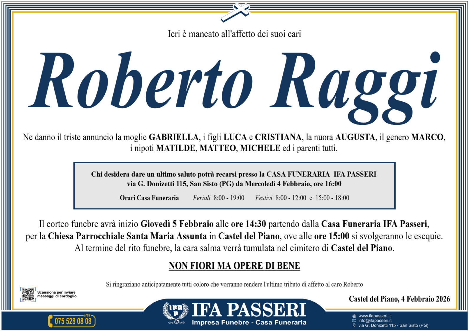 Roberto Raggi Giovedì 5 Febbraio ࠃ Partenza Casa Funeraria IFA Passeri, ore 14:30 Chiesa Parrocchiale Santa Maria Assunta in Castel del Piano, ore 15:00 Non fiori ma opere di bene Label Nome e Cognome* La tua Email* Modalità di pubblicazione: Autorizzo l'invio ai familiari e l'eventuale pubblicazione sul sito Ifapasseri Autorizzo esclusivamente l'invio riservato ai familiari Ho preso visione della Privacy Policy e della Cookie Policy del portale ifapasseri.it ed accetto espressamente il trattamento dei dati richiesti. Label Nome e Cognome* La tua Email* Ho preso visione della Privacy Policy e della Cookie Policy del portale ifapasseri.it ed accetto espressamente il trattamento dei dati richiesti. 0 Messaggi Inline Feedbacks View all comments