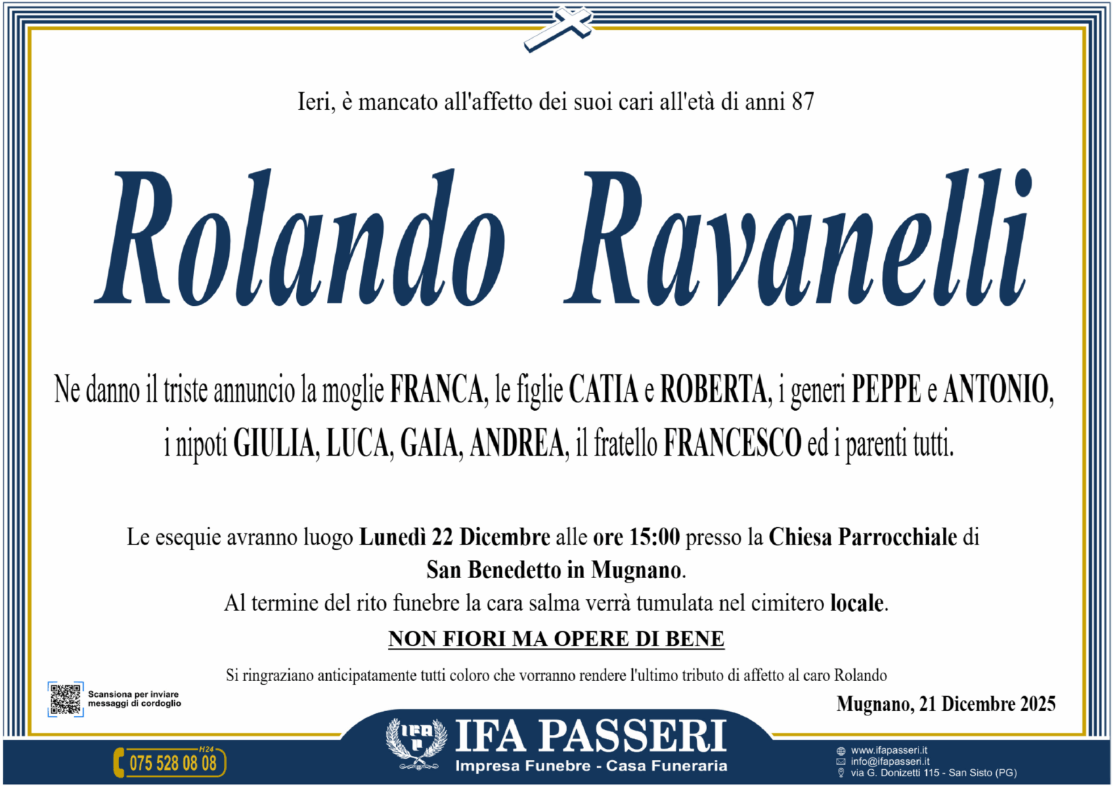 Rolando Ravanelli Lunedì 22 Dicembre Chiesa San Benedetto in Mugnano, ore 15:00 Non fiori ma opere di bene Label Nome e Cognome* La tua Email* Modalità di pubblicazione: Autorizzo l'invio ai familiari e l'eventuale pubblicazione sul sito Ifapasseri Autorizzo esclusivamente l'invio riservato ai familiari Ho preso visione della Privacy Policy e della Cookie Policy del portale ifapasseri.it ed accetto espressamente il trattamento dei dati richiesti. Label Nome e Cognome* La tua Email* Ho preso visione della Privacy Policy e della Cookie Policy del portale ifapasseri.it ed accetto espressamente il trattamento dei dati richiesti. 0 Messaggi Inline Feedbacks View all comments
