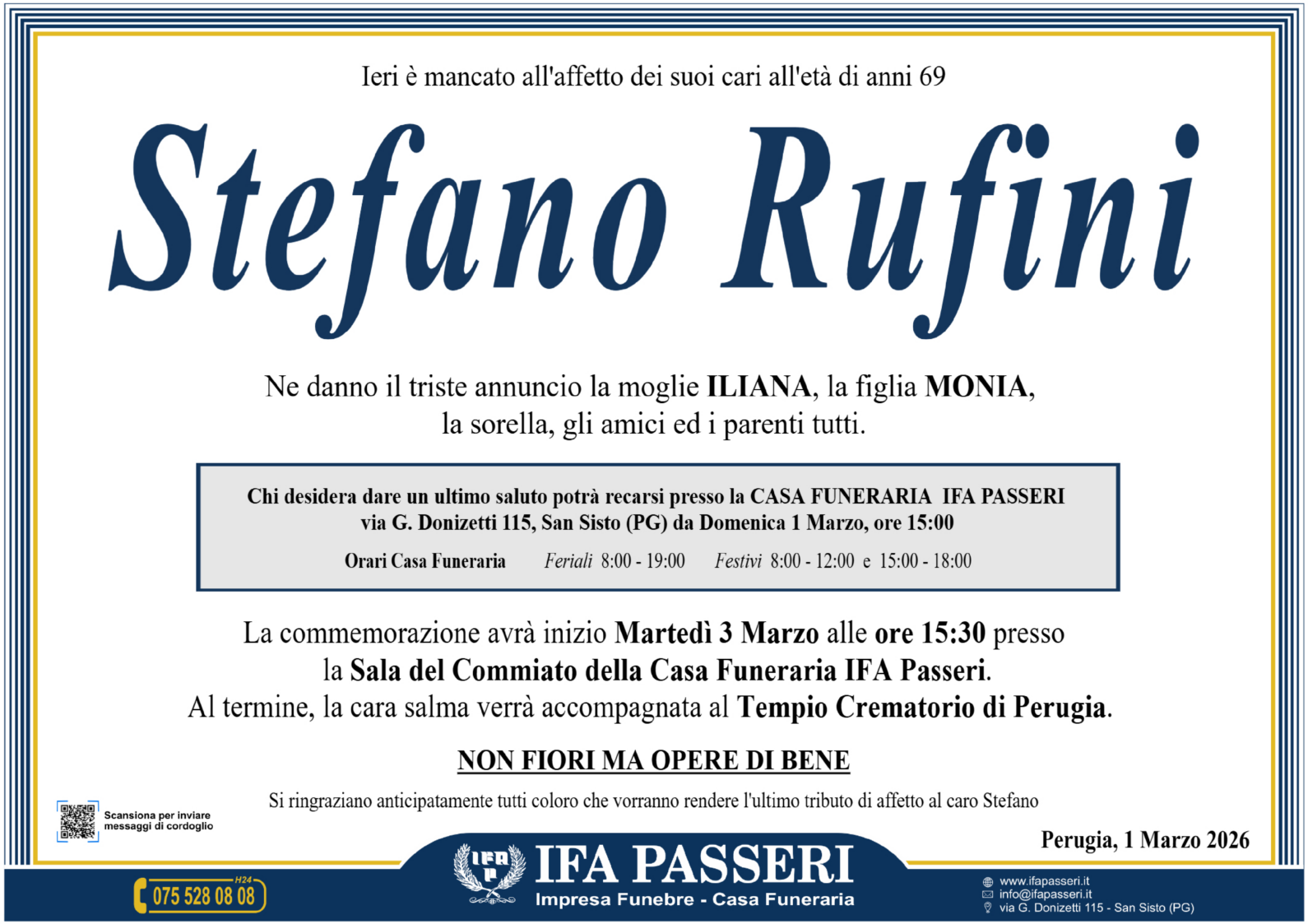 Commemorazione presso la Sala del Commiato della Casa Funeraria IFA Passeri in via G. Donizetti in San Sisto - Perugia, alle ore 15:30