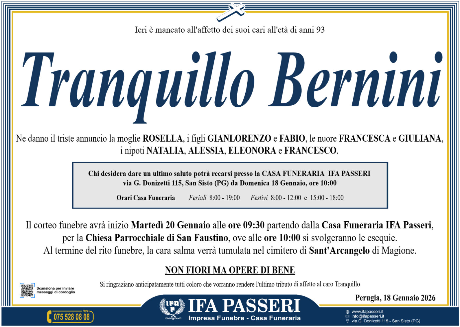 Tranquillo Bernini Martedì 20 Gennaio ࠃ Partenza Casa Funeraria IFA Passeri, ore 9:30 Chiesa Parrocchiale di San Faustino, ore 10:00 Non fiori ma opere di bene Label Nome e Cognome* La tua Email* Modalità di pubblicazione: Autorizzo l'invio ai familiari e l'eventuale pubblicazione sul sito Ifapasseri Autorizzo esclusivamente l'invio riservato ai familiari Ho preso visione della Privacy Policy e della Cookie Policy del portale ifapasseri.it ed accetto espressamente il trattamento dei dati richiesti. Label Nome e Cognome* La tua Email* Ho preso visione della Privacy Policy e della Cookie Policy del portale ifapasseri.it ed accetto espressamente il trattamento dei dati richiesti. 1 Messaggio Inline Feedbacks View all comments Elisabetta e Luca Bernini Gennaio 18, 2026 12:21 pm Le nostre sincere condoglianze per la grave perdita